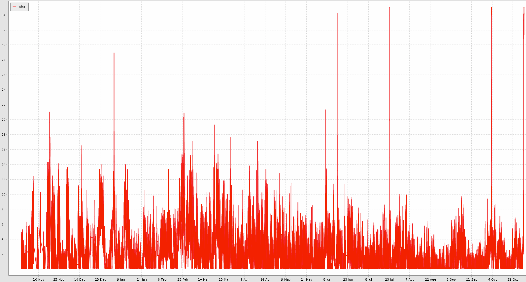 Ich zeichne viele Sensordaten seit ca. 1 Jahr im Openhab auf. Dort haben ich dann neuerdings auch OWM (Open Weather MAP) eingebunden. Die Daten für die Windgeschwindigkeit haben mir dann als Referenz geholt. In einer Grafik schau ich mir dann die beiden Werte an. Eine gleichmäßige Abweichung ist für mich völlig OK. Nur heute wieder dieser Sprung.