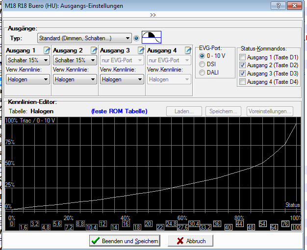 das HU hast du mir damals verkauft - ist vom Sommer 2014, siehe Anhang. Im Waschzettel steht drei Ausgänge, in der Pro sehe ich vier wobei der vierte ausgegraute Einstellungen hat, ein Kommando kann ich aber hinschicken - ich vermute aber mal für DALI wird der gehen. Dann muss ich allerdings auf die Einzeln schaltbaren Downlights verzichten oder diese anders ansteuern (kommen eh mit ner eigenen FB weil die nicht integrierbar sind, wäre also nicht so tragisch..).