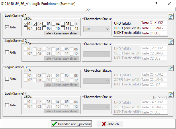 Ende Dezember 2017 habe ich mich an die Sache wieder gewagt und lediglich in der Logik nicht auf den EIN-Zustand geschaut sonder auf den AUS-Zustand der LED's, dann die Tastentabelle C1 (Auswertung der Logik-Funktion) entsprechend angepasst. und siehe da, seitdem ist kein Abfallen der Relais zu erkennen (sichtlich).