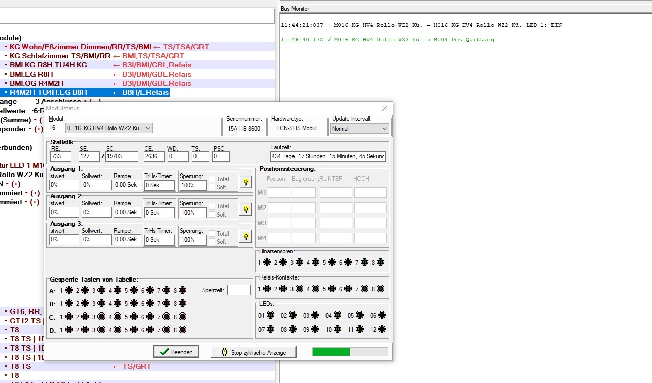 Hallo Uwe, vielen Dank. Die Mail ist angekommen. Zu dem Problem, dass das mit der LED1 auf an setzten nicht funktioniert. Ich hab eimal den Bus Monitor angeschmissen und dabei folgendes gesehen (s. Anlage). Wenn ich den Taster drücke geht der Befehl die LED 1 zu setzen raus (11:44:21:837). Aber erst wenn ich den Status des Modul in der pro öffne kommt die Quittung (11:46:40:172). Jetzt an Modul 4 (meine LinHK, die der Pro ja den Zugang gewährt. Anscheinend wird die LED vorher nicht wirklich gesetzt. Bin ich da auf der richtigen Spur? Wie kann das sein und warum gibt es überhaupt noch eine Quittung? Wenn ich mit dem Taster mein Licht im Arbeitszimmer schalten gibt es auch keine. Es gibt nur die Meldung, dass der Ausgang geschaltet ist.