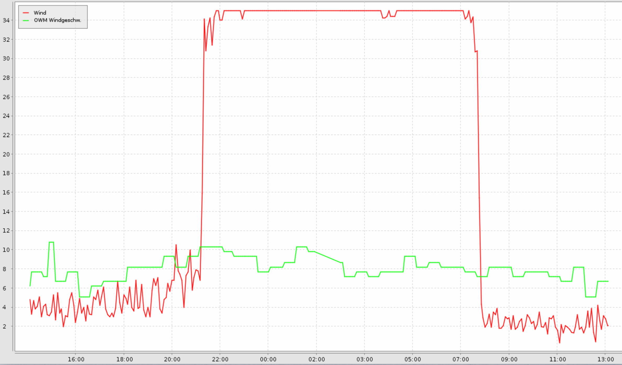 Ich zeichne viele Sensordaten seit ca. 1 Jahr im Openhab auf. Dort haben ich dann neuerdings auch OWM (Open Weather MAP) eingebunden. Die Daten für die Windgeschwindigkeit haben mir dann als Referenz geholt. In einer Grafik schau ich mir dann die beiden Werte an. Eine gleichmäßige Abweichung ist für mich völlig OK. Nur heute wieder dieser Sprung.