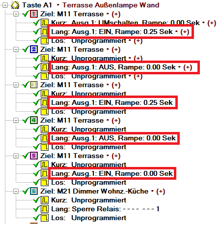 Ich wollte dies nun via LCN-Pro auf Lang legen. Leider geht dies auch nicht. Ich habe hierbei mit versch. Rampenzeiten (auch 0) herumgespielt. Kann es sein, dass wenn Rampe = 0s ist, LCN meint, dass die Lampe bereits eingeschaltet ist und die schnelle Befehlswiederholung AUS/EIN etc. nicht durchführt? Gibt es einen Möglichkeit die Lampe wie gewünscht einzuschalten?