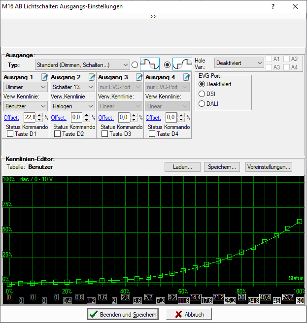 Aber die greift nicht. Bei Kommando "Ausgang EIN", bekommt der Ausgang auch die vollen 240V. Ich habe mal testweise eine noch flachere Dimmrampe definiert mit maximal 30% Ausgangspegel, auch da volle Helligkeit bei "Ausgang EIN". Wenn ich dagegen das Kommando "Helligkeit 30%" sende, ergibt es schön gedimmtes Licht, unabhängig von der Kennlinie.