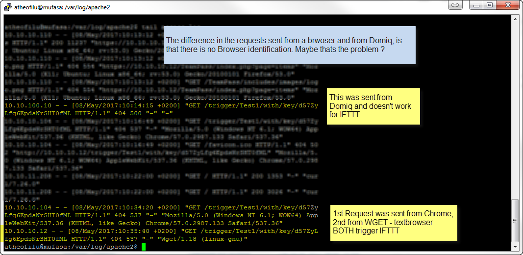 So wie es aussieht schickt Domiq beim Get keine Browser Info mit und dies scheint IFTTT nicht zu mögen... siehe Anhang