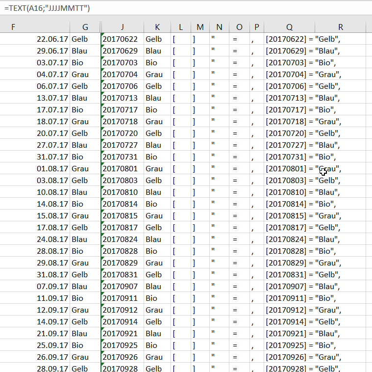 daten = {[20170505] = "Blau",[20170508] = "Bio",[20170509] = "Grau",[20170511] = "Gelb",[20170518] = "Blau",[20170522] = "Bio",[20170523] = "Grau",[20170526] = "Gelb",[20170601] = "Blau",[20170606] = "Bio",[20170607] = "Grau",[20170609] = "Gelb",[20170616] = "Blau",[20170619] = "Bio",[20170620] = "Grau",[20170622] = "Gelb",[20170629] = "Blau",[20170703] = "Bio",[20170704] = "Grau",[20170706] = "Gelb",[20170713] = "Blau",[20170717] = "Bio",[20170718] = "Grau",[20170720] = "Gelb",[20170727] = "Blau",[20170731] = "Bio",[20170801] = "Grau",[20170803] = "Gelb",[20170810] = "Blau",[20170814] = "Bio",[20170815] = "Grau",[20170817] = "Gelb",[20170824] = "Blau",[20170828] = "Bio",[20170829] = "Grau",[20170831] = "Gelb",[20170907] = "Blau",[20170911] = "Bio",[20170912] = "Grau",[20170914] = "Gelb",[20170921] = "Blau",[20170925] = "Bio",[20170926] = "Grau",[20170928] = "Gelb",[20171006] = "Blau",[20171009] = "Bio",[20171010] = "Grau",[20171012] = "Gelb",[20171019] = "Blau",[20171023] = "Bio",[20171024] = "Grau",[20171026] = "Gelb",[20171103] = "Blau",[20171106] = "Bio",[20171107] = "Grau",[20171109] = "Gelb",[20171116] = "Blau",[20171120] = "Bio",[20171121] = "Grau",[20171123] = "Gelb",[20171130] = "Blau",[20171204] = "Bio",[20171205] = "Grau",[20171207] = "Gelb",[20171214] = "Blau",[20171218] = "Bio",[20171219] = "Grau",[20171221] = "Gelb",[20171229] = "Blau"}